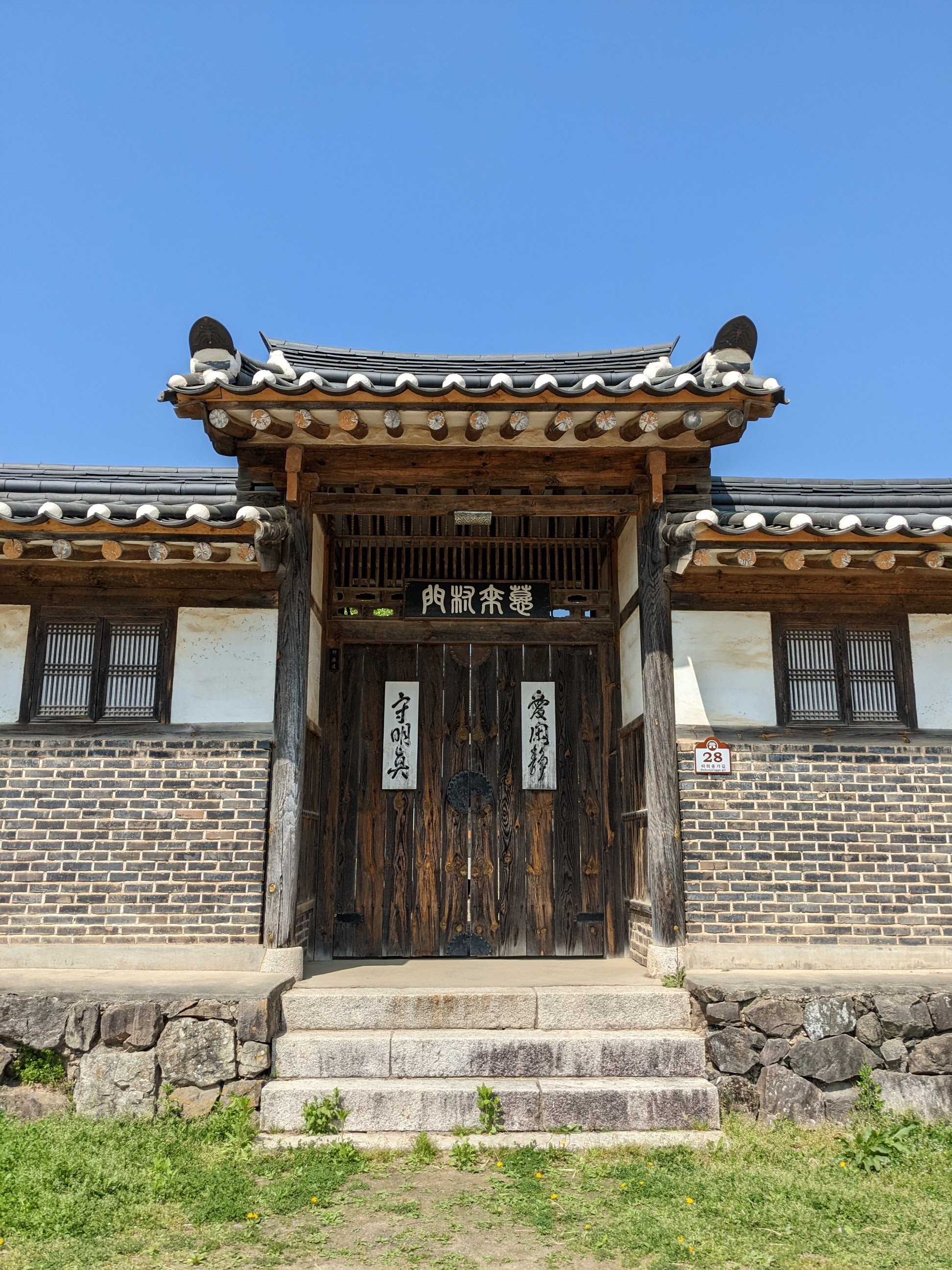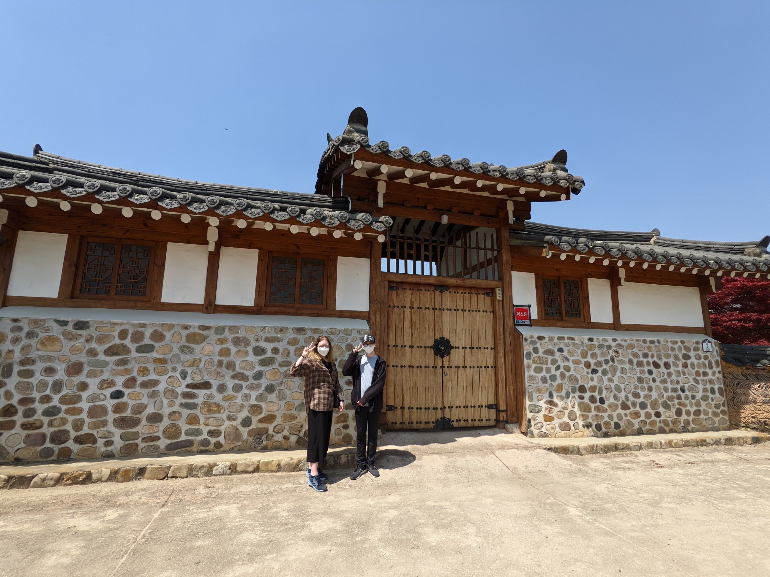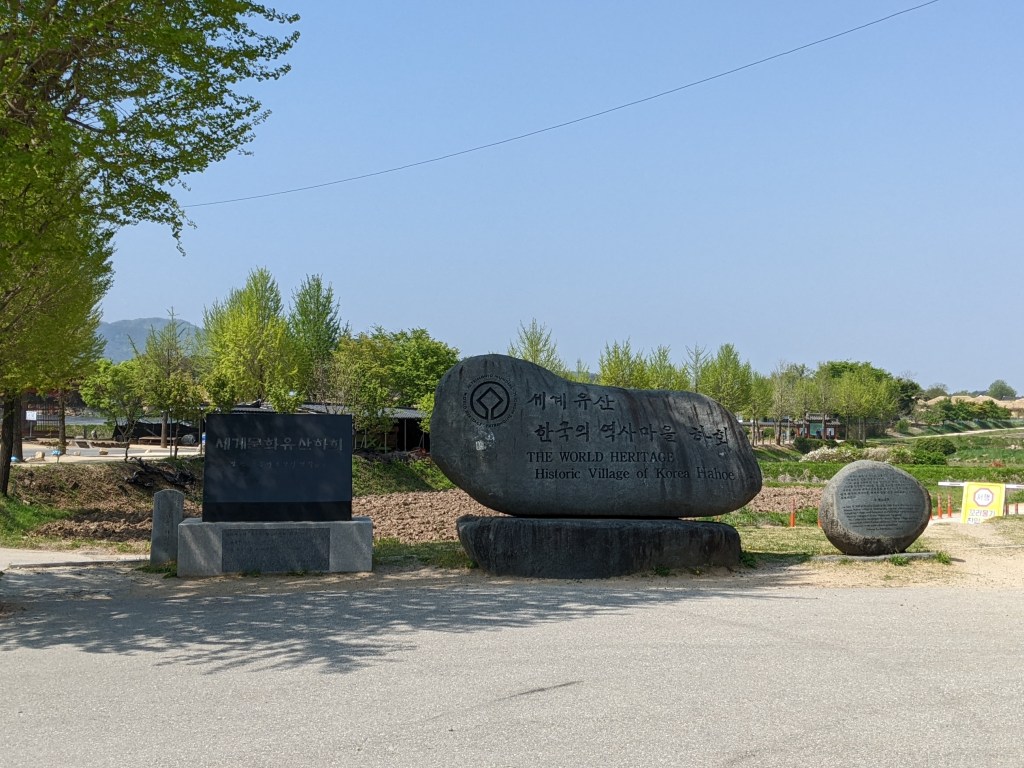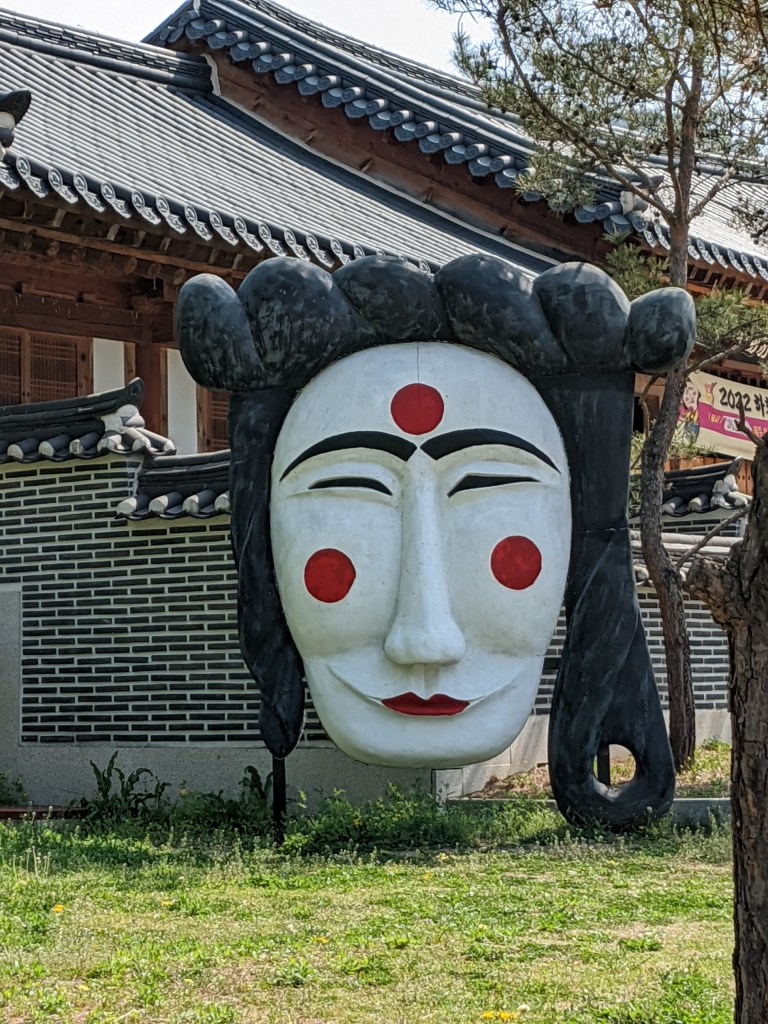 We went to the Hahoe Village – another UNESCO heritage site. The whole village is included. It is really neat to see the thatched and tiled roofs. Our tour guide told us the thatch is for commoners and the tile is for higher-ranking individuals. The best thing about this village, I thought, is that people live there and carry on their modern lives in the same houses and structures that have been there for generations. There are modern conveniences visible everywhere, like satellite dishes and wires for internet and power, but it still looks pretty cool. We saw the mask dance while we were there. Several things happened at the mask dance… First, we were fake peed on by a cow-costumed dance duo, three times. Second, the butcher-mask-clad dancer killed the peeing cow, cut off its testicles, and then offered them to us with a big, “Hello!.” And, finally, Matilda was hit up for a donation by the widow-mask-clad dancer because, as a widow, she had no one to take care of her. He thanked her for the donation after the show – all of the dancers are men.