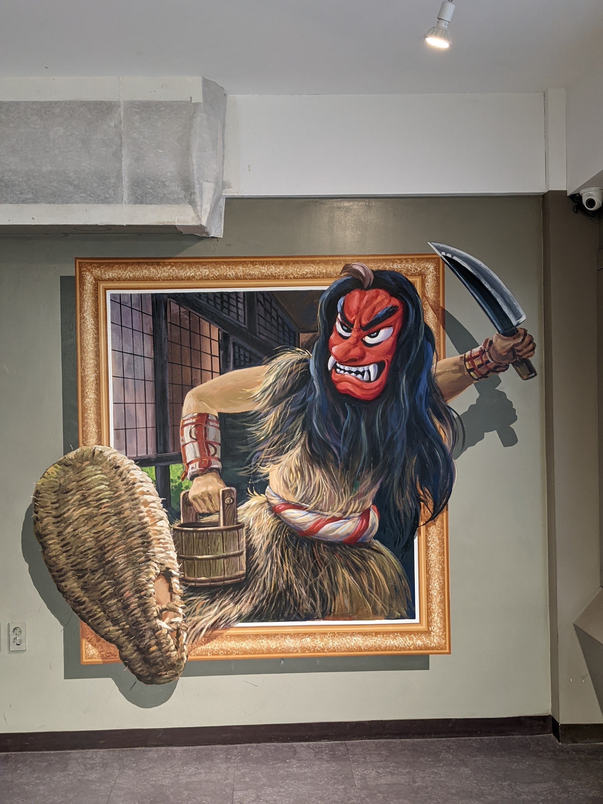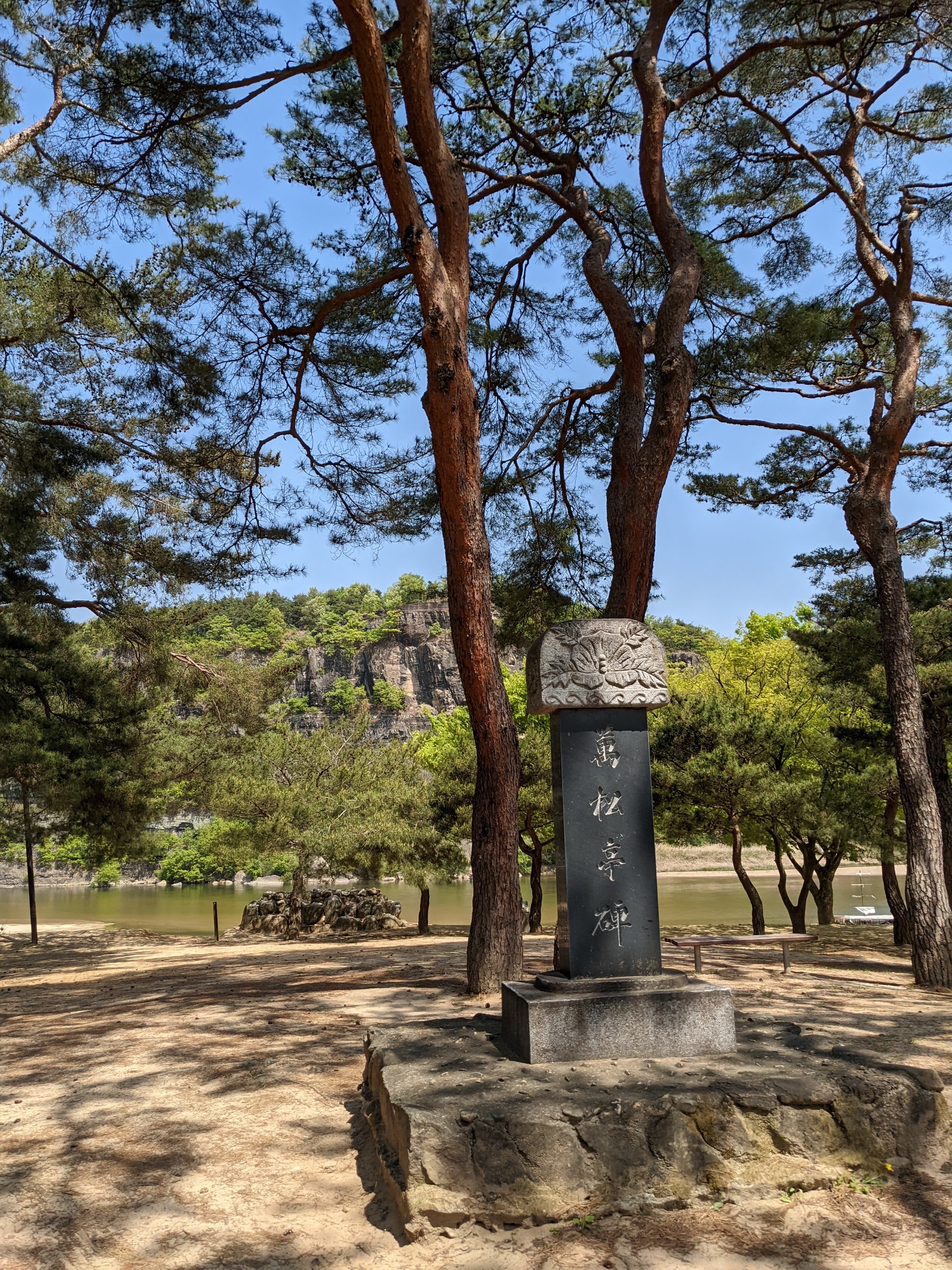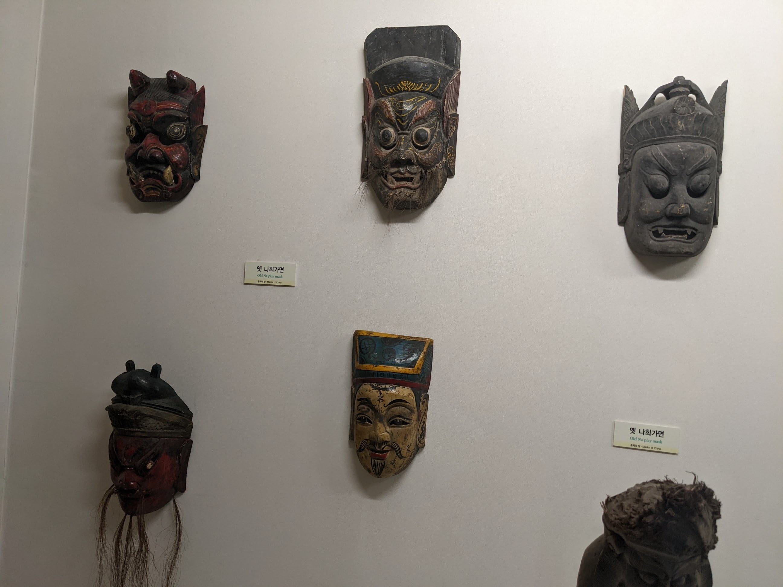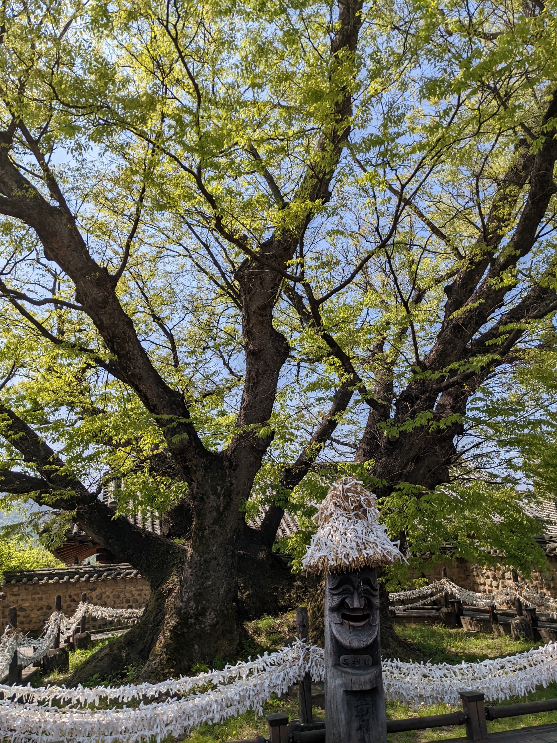 We went to the Hahoe Village – another UNESCO heritage site. The whole village is included. It is really neat to see the thatched and tiled roofs. Our tour guide told us the thatch is for commoners and the tile is for higher-ranking individuals. The best thing about this village, I thought, is that people live there and carry on their modern lives in the same houses and structures that have been there for generations. There are modern conveniences visible everywhere, like satellite dishes and wires for internet and power, but it still looks pretty cool. We saw the mask dance while we were there. Several things happened at the mask dance… First, we were fake peed on by a cow-costumed dance duo, three times. Second, the butcher-mask-clad dancer killed the peeing cow, cut off its testicles, and then offered them to us with a big, “Hello!.” And, finally, Matilda was hit up for a donation by the widow-mask-clad dancer because, as a widow, she had no one to take care of her. He thanked her for the donation after the show – all of the dancers are men.